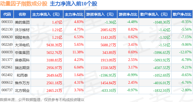 资金流向方面,动量因子(980057)指数成份股当日主力资金净流出合计5.33亿元,游资资金净流入合计2.12亿元,散户资金净流入合计3.21亿元。成份股资金流向详情见下表: