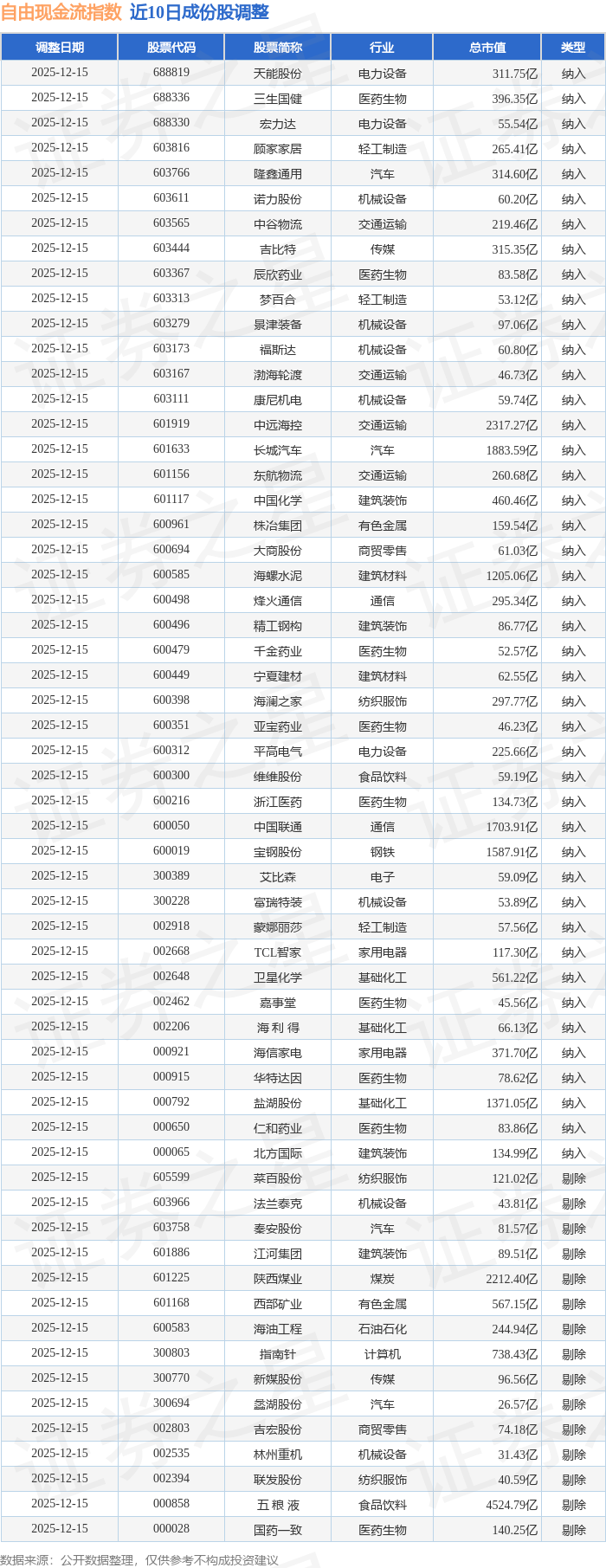 近10日内自由现金流(980092)指数成份股做了调整,新纳入了44只股票,剔除了15只股票。