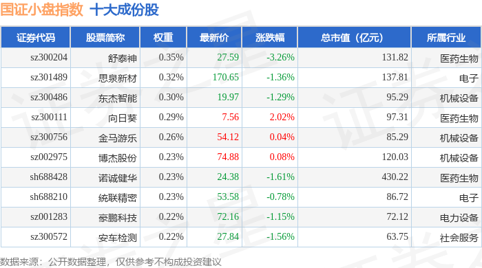 证券之星消息,12月3日,国证小盘(980202)指数报收于1742.01点,跌0.83%,成交1833.6亿元,换手率3.85%。当日该指数成份股中,上涨的有361家,粤万年青以15.32%的涨幅领涨,下跌的有1113家,昆工科技以13.49%的跌幅领跌。