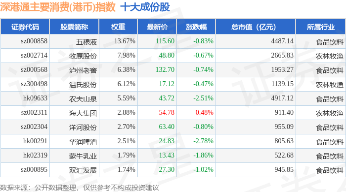 深港通主要消费(港币)(983022)指数十大成份股详情如下: