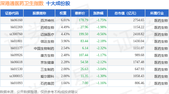 深港通医药卫生(983023)指数十大成份股详情如下: