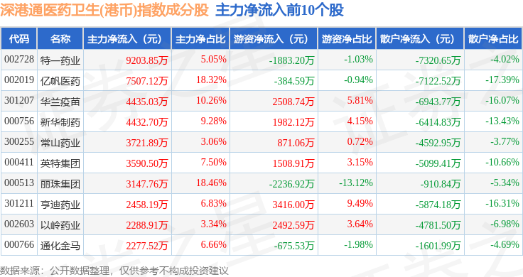 资金流向方面,深港通医药卫生(港币)(983024)指数成份股当日主力资金净流出合计10.16亿元,游资资金净流入合计3.78亿元,散户资金净流入合计6.38亿元。成份股资金流向详情见下表: