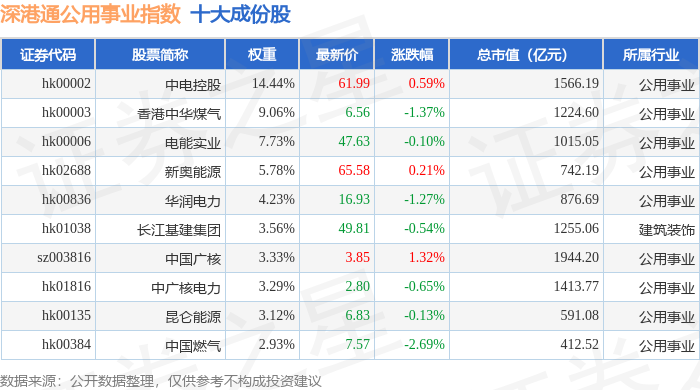证券之星消息,12月3日,深港通公用事业(983031)指数报收于4445.13点,跌0.28%,成交71.66亿元,换手率0.45%。当日该指数成份股中,上涨的有27家,闽东电力以10.02%的涨幅领涨,下跌的有37家,赫美集团以3.82%的跌幅领跌。