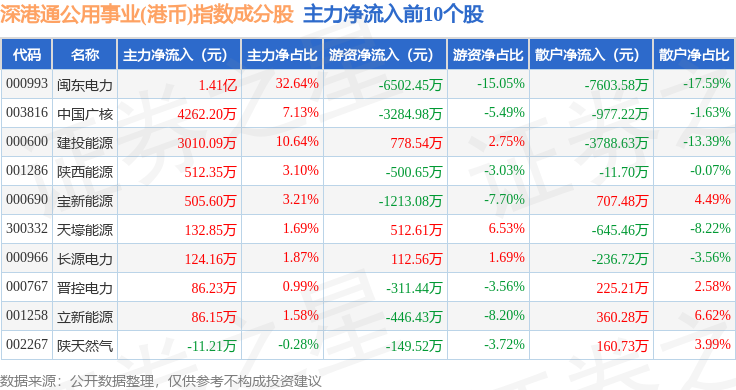 资金流向方面,深港通公用事业(港币)(983032)指数成份股当日主力资金净流出合计1.16亿元,游资资金净流出合计8294.09万元,散户资金净流入合计1.99亿元。成份股资金流向详情见下表: