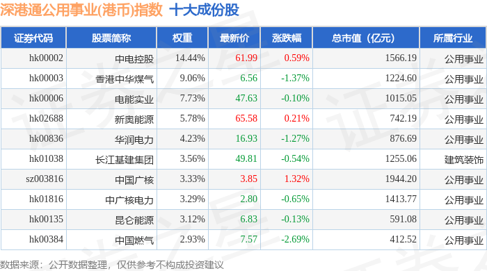 深港通公用事业(港币)(983032)指数十大成份股详情如下: