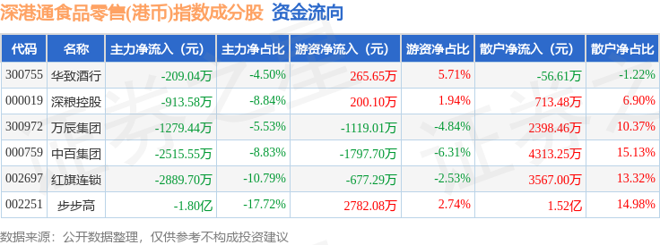 资金流向方面,深港通食品零售(港币)(983038)指数成份股当日主力资金净流出合计2.58亿元,游资资金净流出合计346.18万元,散户资金净流入合计2.62亿元。成份股资金流向详情见下表:
