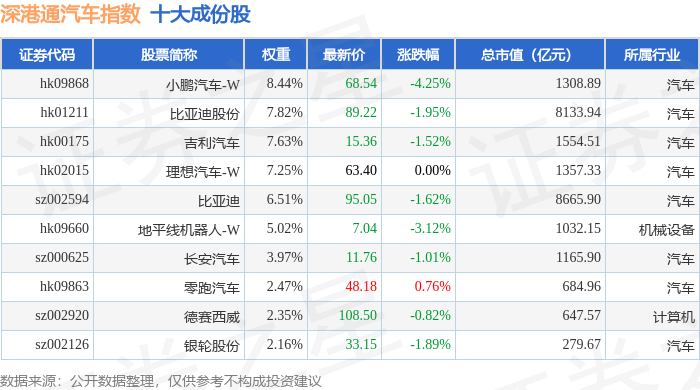 深港通汽车(983039)指数十大成份股详情如下: