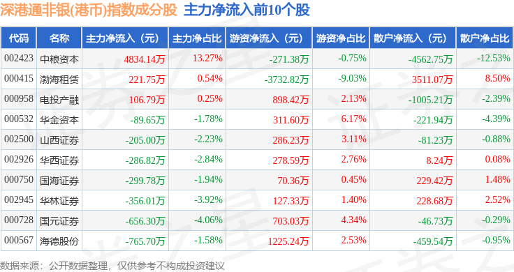 资金流向方面,深港通非银(港币)(983054)指数成份股当日主力资金净流出合计14.42亿元,游资资金净流入合计4.62亿元,散户资金净流入合计9.8亿元。成份股资金流向详情见下表: