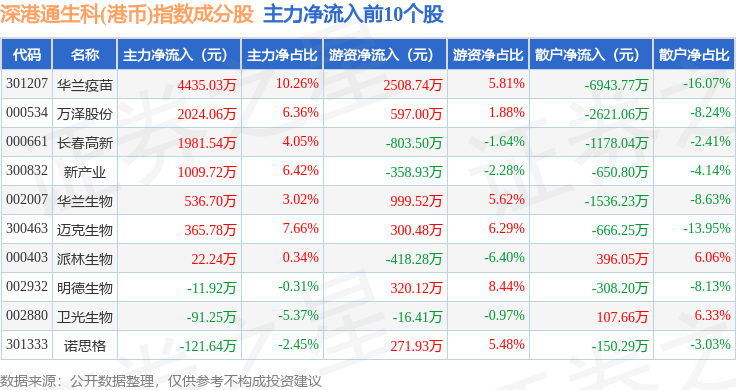 资金流向方面,深港通生科(港币)(983060)指数成份股当日主力资金净流出合计2.28亿元,游资资金净流入合计1.18亿元,散户资金净流入合计1.09亿元。成份股资金流向详情见下表:
