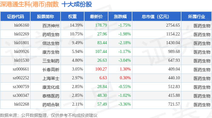 深港通生科(港币)(983060)指数十大成份股详情如下: