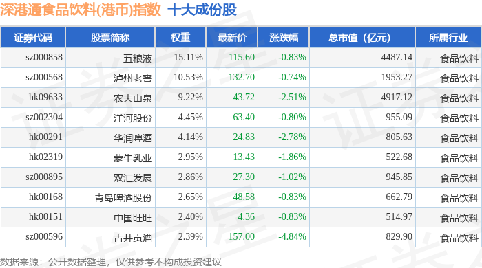 深港通食品饮料(港币)(983066)指数十大成份股详情如下: