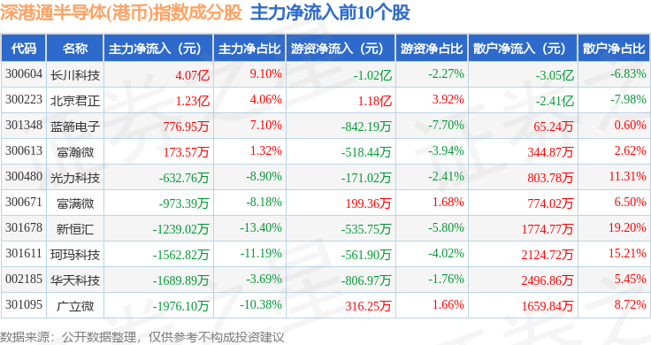 资金流向方面,深港通半导体(港币)(983068)指数成份股当日主力资金净流出合计20.18亿元,游资资金净流入合计4.04亿元,散户资金净流入合计16.14亿元。成份股资金流向详情见下表: