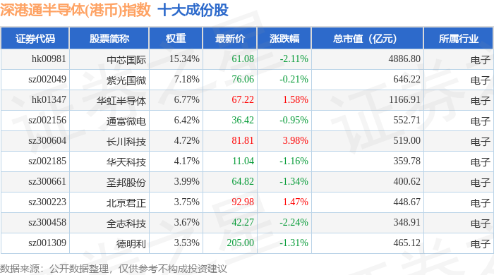 深港通半导体(港币)(983068)指数十大成份股详情如下: