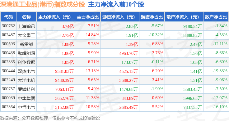 资金流向方面,深港通工业品(港币)(983070)指数成份股当日主力资金净流出合计74.37亿元,游资资金净流入合计11.57亿元,散户资金净流入合计62.79亿元。成份股资金流向详情见下表: