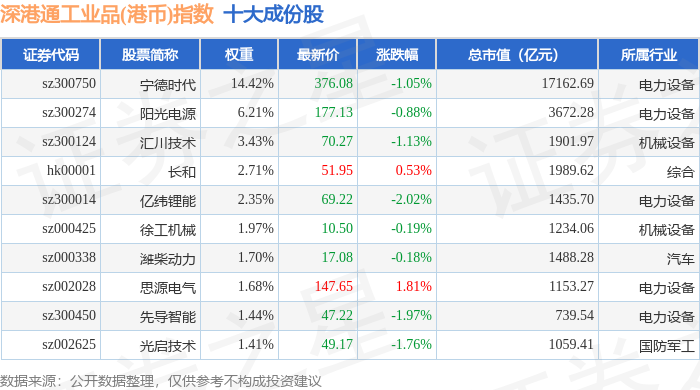 深港通工业品(港币)(983070)指数十大成份股详情如下: