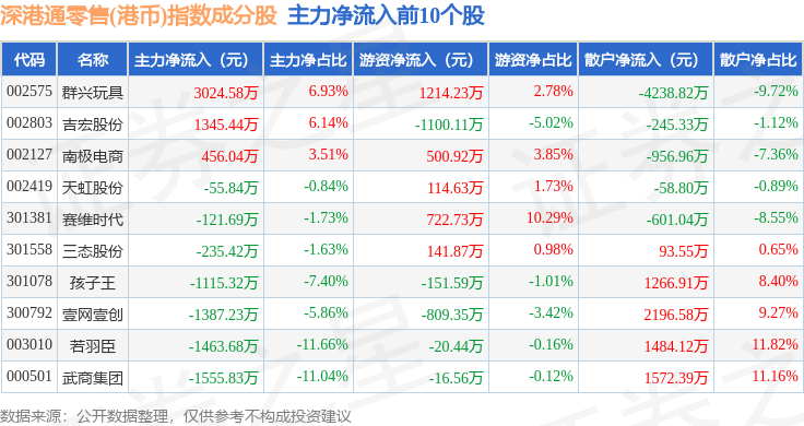 资金流向方面,深港通零售(港币)(983074)指数成份股当日主力资金净流出合计4.49亿元,游资资金净流入合计1302.45万元,散户资金净流入合计4.36亿元。成份股资金流向详情见下表: