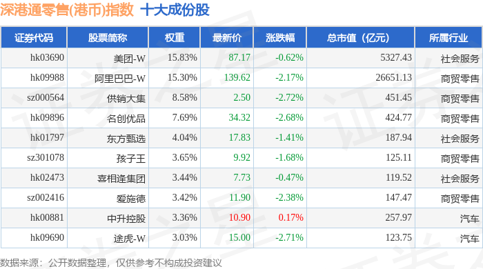深港通零售(港币)(983074)指数十大成份股详情如下: