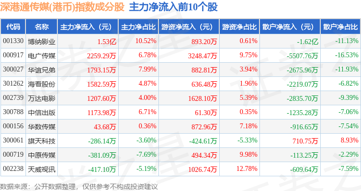 资金流向方面,深港通传媒(港币)(983076)指数成份股当日主力资金净流出合计25.58亿元,游资资金净流入合计2.63亿元,散户资金净流入合计22.95亿元。成份股资金流向详情见下表: