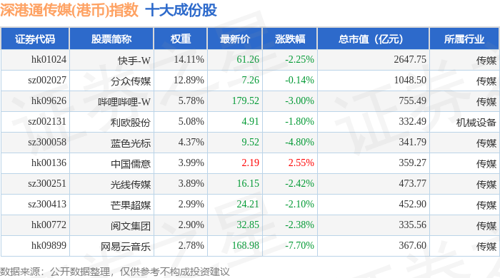 深港通传媒(港币)(983076)指数十大成份股详情如下: