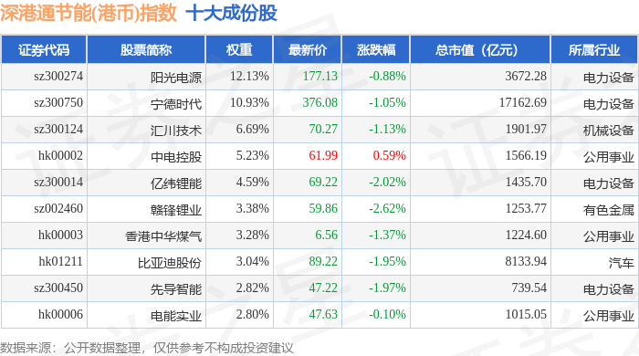 深港通节能(港币)(983086)指数十大成份股详情如下: