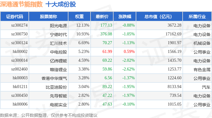 证券之星消息,12月3日,深港通节能(983085)指数报收于2243.59点,跌1.27%,成交522.81亿元,换手率0.71%。当日该指数成份股中,上涨的有6家,中国广核以1.32%的涨幅领涨,下跌的有42家,天华新能以5.04%的跌幅领跌。
