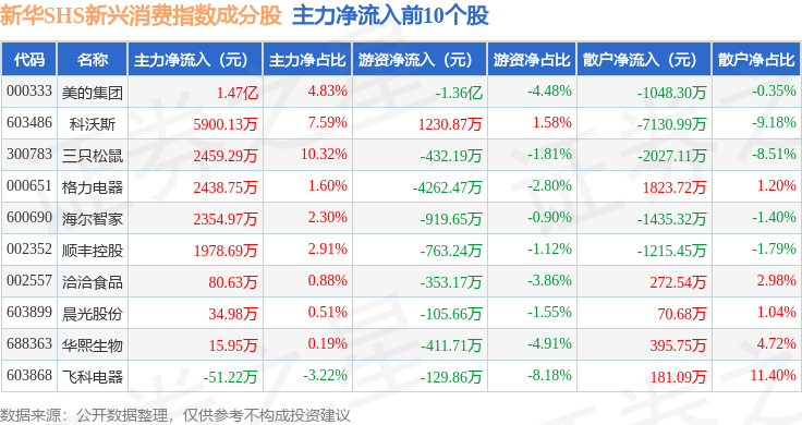 资金流向方面,新华SHS新兴消费(989006)指数成份股当日主力资金净流出合计11.6亿元,游资资金净流入合计9497.32万元,散户资金净流入合计10.65亿元。成份股资金流向详情见下表: