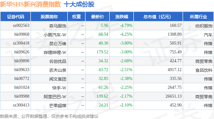 新华SHS新兴消费(989006)指数十大成份股详情如下: