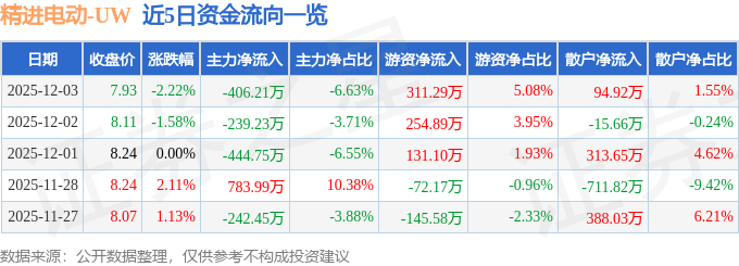 证券之星消息,截至2025年12月3日收盘,精进电动(688280)报收于7.93元,下跌2.22%,换手率1.48%,成交量7.69万手,成交额6129.34万元。