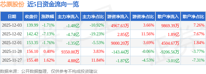12月3日的资金流向数据方面,主力资金净流出1.48亿元,占总成交额10.92%,游资资金净流入4967.63万元,占总成交额3.66%,散户资金净流入9869.39万元,占总成交额7.26%。