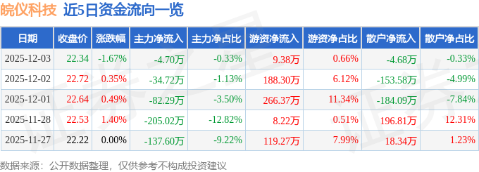 证券之星消息,截至2025年12月3日收盘,皖仪科技(688600)报收于22.34元,下跌1.67%,换手率0.47%,成交量6385.0手,成交额1430.9万元。