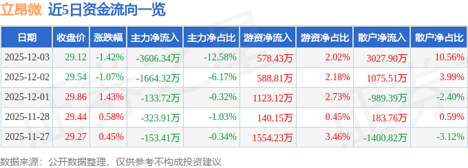 证券之星消息,截至2025年12月3日收盘,立昂微(605358)报收于29.12元,下跌1.42%,换手率1.46%,成交量9.77万手,成交额2.87亿元。