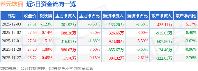 证券之星消息,截至2025年12月3日收盘,养元饮品(603156)报收于27.31元,下跌1.23%,换手率0.24%,成交量3.07万手,成交额8412.4万元。