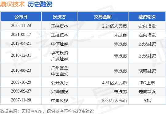 证券之星消息,根据天眼查APP于11月24日公布的信息整理,北京鼎汉技术集团股份有限公司定向增发融资,融资额2.24亿人民币,参与投资的机构包括工控资本。