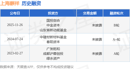 证券之星消息,根据天眼查APP于11月26日公布的信息整理,上海麒祥新材料科技股份有限公司B轮融资,融资额未披露,参与投资的机构包括国投创合,中金资本,山东省新动能基金。