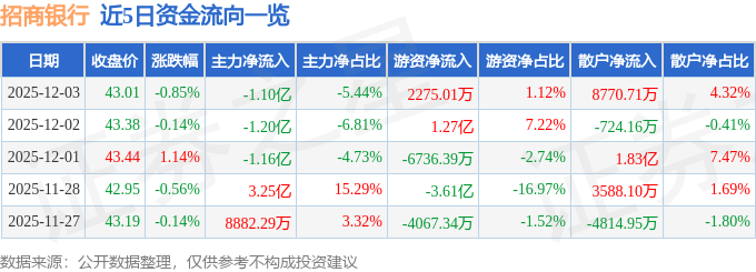 证券之星消息,截至2025年12月3日收盘,招商银行(600036)报收于43.01元,下跌0.85%,换手率0.23%,成交量46.9万手,成交额20.29亿元。