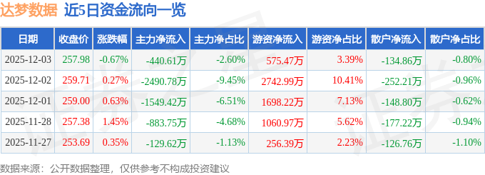 证券之星消息,截至2025年12月3日收盘,达梦数据(688692)报收于257.98元,下跌0.67%,换手率0.89%,成交量6523.0手,成交额1.7亿元。