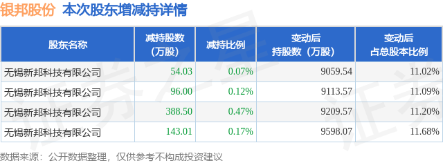 证券之星消息,12月3日银邦股份发布公告《银邦股份:银邦股份关于公司持股5%以上股东减持股份计划实施完毕的公告》,其股东无锡新邦科技有限公司于2025年11月21日至2025年12月3日间合计减持681.54万股,占公司目前总股本的0.8292%,变动期间该股股价上涨12.08%,截止12月3日收盘报11.41元。