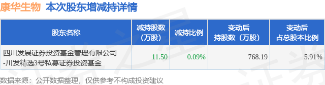证券之星消息,12月3日康华生物发布公告《康华生物:关于持股5%以上股东减持计划期限届满暨实施结果的公告》,其股东四川发展证券投资基金管理有限公司-川发精选3号私募证券投资基金于2025年11月22日至2025年12月1日间合计减持11.5万股,占公司目前总股本的0.0885%,变动期间该股股价上涨8.97%,截止12月1日收盘报84.21元。