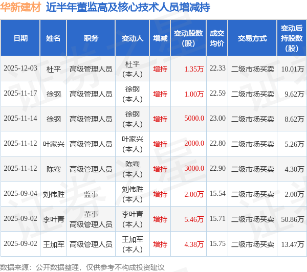华新建材近半年内的董监高及核心技术人员增减持详情如下: