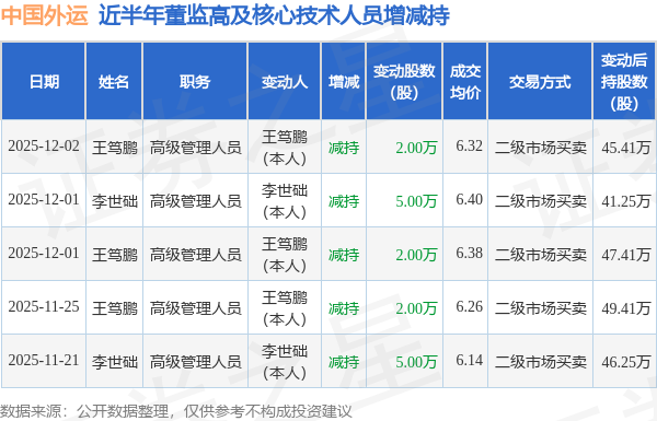 中国外运近半年内的董监高及核心技术人员增减持详情如下: