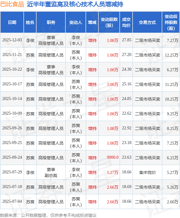 巴比食品近半年内的董监高及核心技术人员增减持详情如下:
