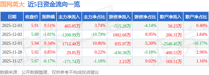 证券之星消息,截至2025年12月3日收盘,国网英大(600517)报收于5.91元,上涨0.51%,换手率0.37%,成交量21.09万手,成交额1.24亿元。