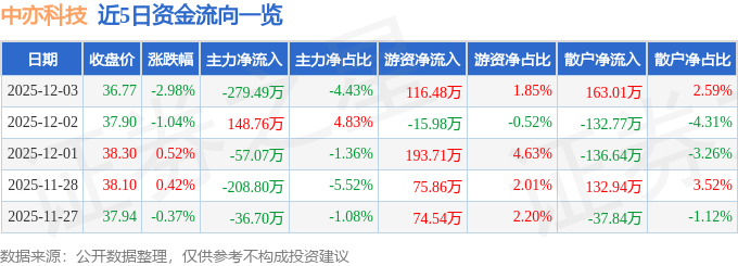 证券之星消息,截至2025年12月3日收盘,中亦科技(301208)报收于36.77元,下跌2.98%,换手率3.4%,成交量1.7万手,成交额6302.04万元。