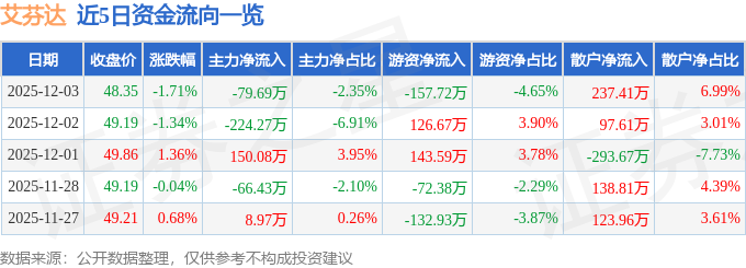证券之星消息,截至2025年12月3日收盘,艾芬达(301575)报收于48.35元,下跌1.71%,换手率4.23%,成交量6991.0手,成交额3394.78万元。