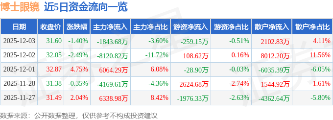证券之星消息,截至2025年12月3日收盘,博士眼镜(300622)报收于31.6元,下跌1.4%,换手率10.25%,成交量15.97万手,成交额5.11亿元。