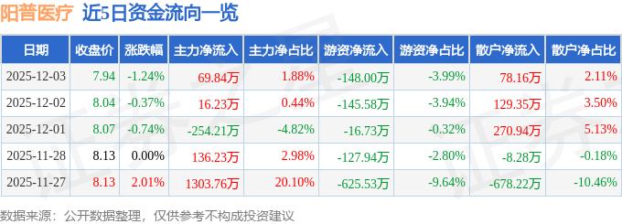 证券之星消息,截至2025年12月3日收盘,阳普医疗(300030)报收于7.94元,下跌1.24%,换手率1.71%,成交量4.66万手,成交额3705.04万元。