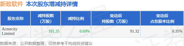 证券之星消息,12月3日新致软件发布公告《新致软件:关于合计持股5%以上股东权益变动至5%以下的提示性公告》,其股东Acmecity Limited于2025年9月10日至2025年12月3日间合计减持181.35万股,占公司目前总股本的0.6898%,变动期间该股股价下跌15.28%,截止12月3日收盘报18.13元。
