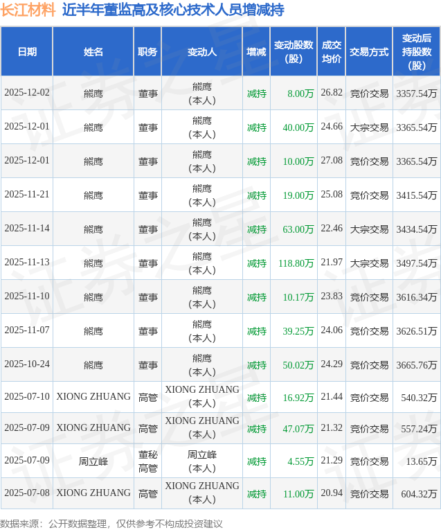 长江材料近半年内的董监高及核心技术人员增减持详情如下: