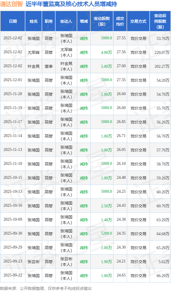 通达创智近半年内的董监高及核心技术人员增减持详情如下: