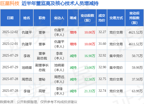 巨星科技近半年内的董监高及核心技术人员增减持详情如下: